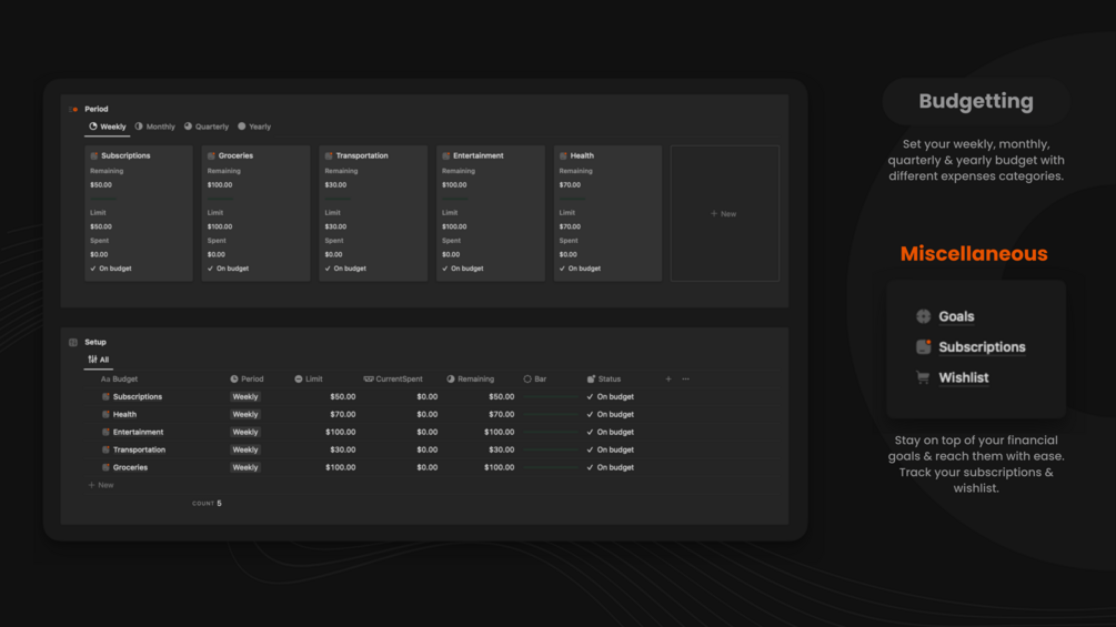 - Budget Management: Allocate budgets for different categories like Subscriptions, Health, Entertainment, Transportation, and Groceries.